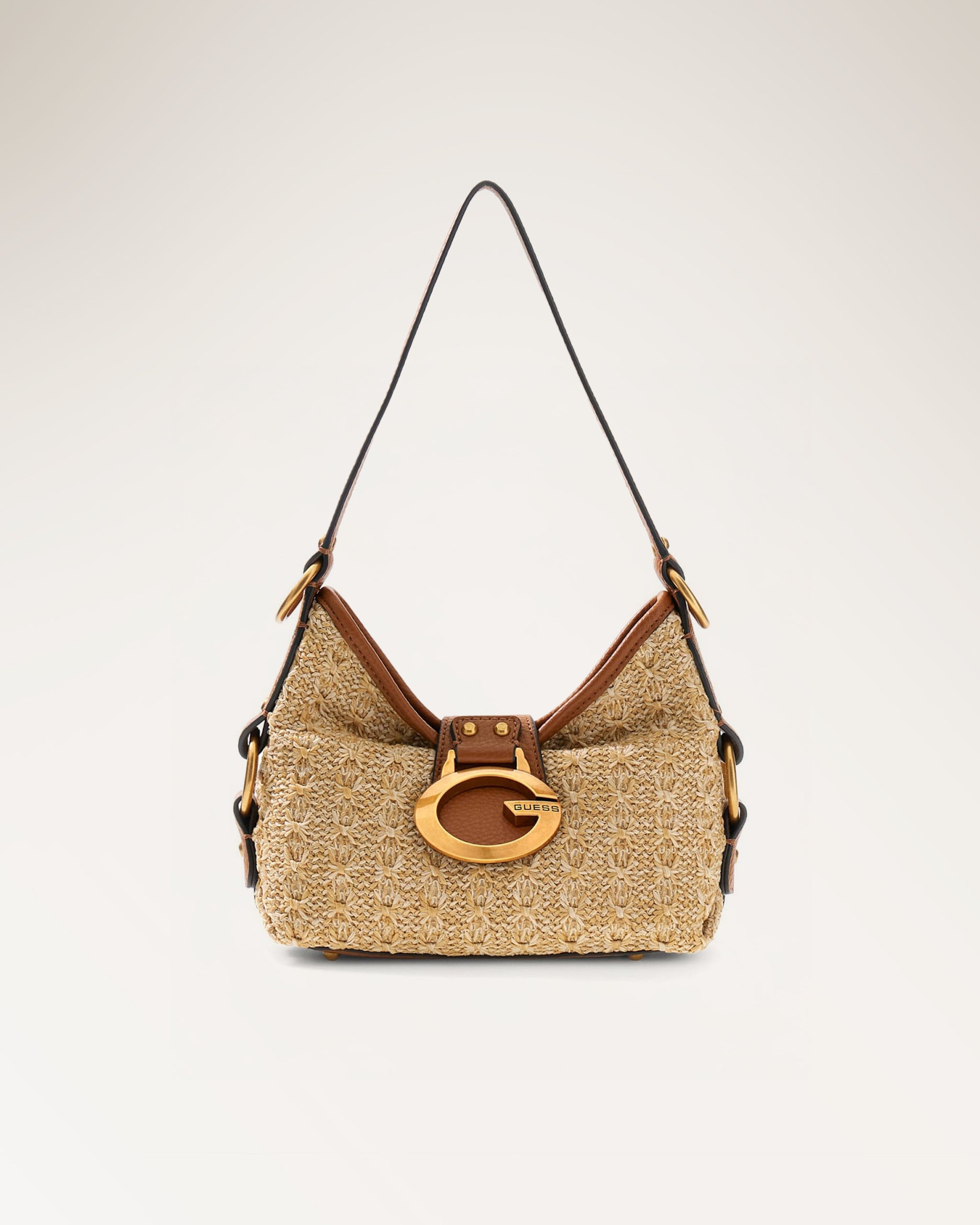 Camden Mini Shoulder Bag di Guess. Borsa a spalla in paglia intrecciata con bordi in pelle. Chiusura ovale dorata e tracolla regolabile.